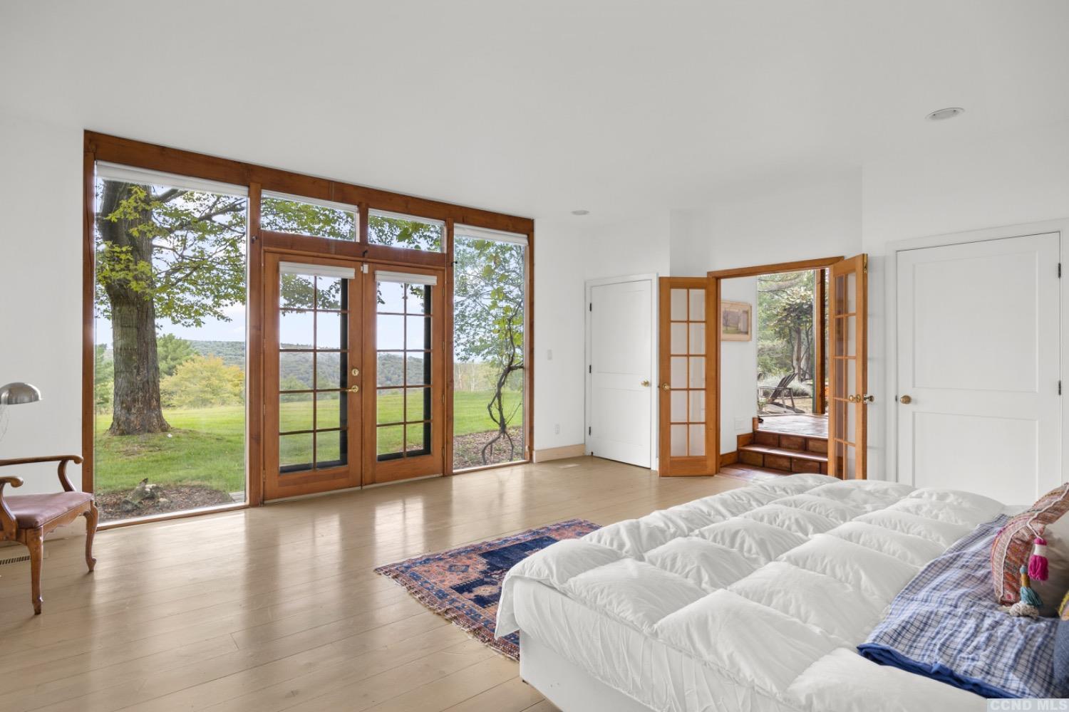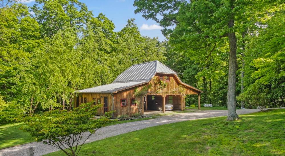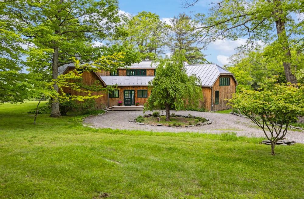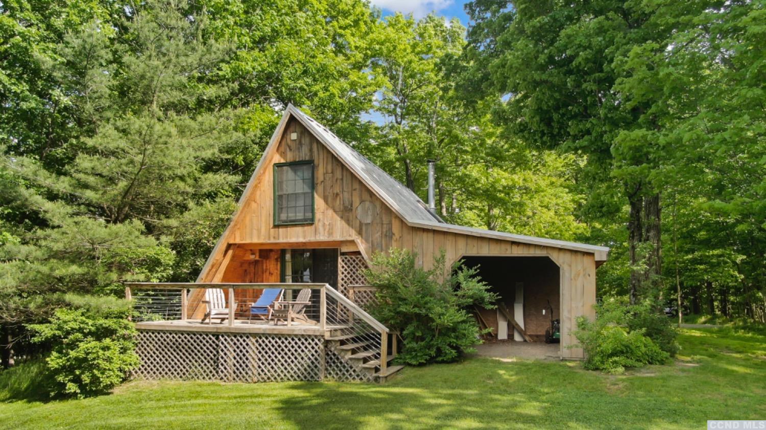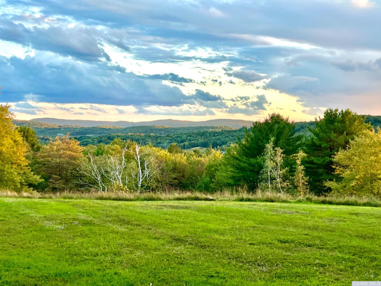 Hilltop Shangri-La overlooking a breathtaking view of the Catskills, rolling hills and valley below. This property evolved from a love of nature and with a strong European influence. You can almost hear Julie Andrews singing The Hills are Alive. The main house has a great room encompassing the kitchen, dining area and living room with fireplace. There are two first level bedrooms and one has built- ins so could easily function as a library or office. The second floor has an ensuite bedroom and bath with dressing/ closet area. There is a 2 plus bay garage/barn with garden room, hobby space and entertainment room. The A-frame has functioned as a guest house and office. The location is so close to many destinations, 25 min to Hudson, 20 min to Great Barrington, 15 to Hawthorne Valley and less than 10 to Chatham Village.