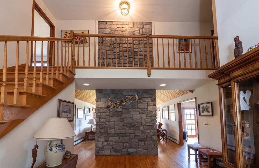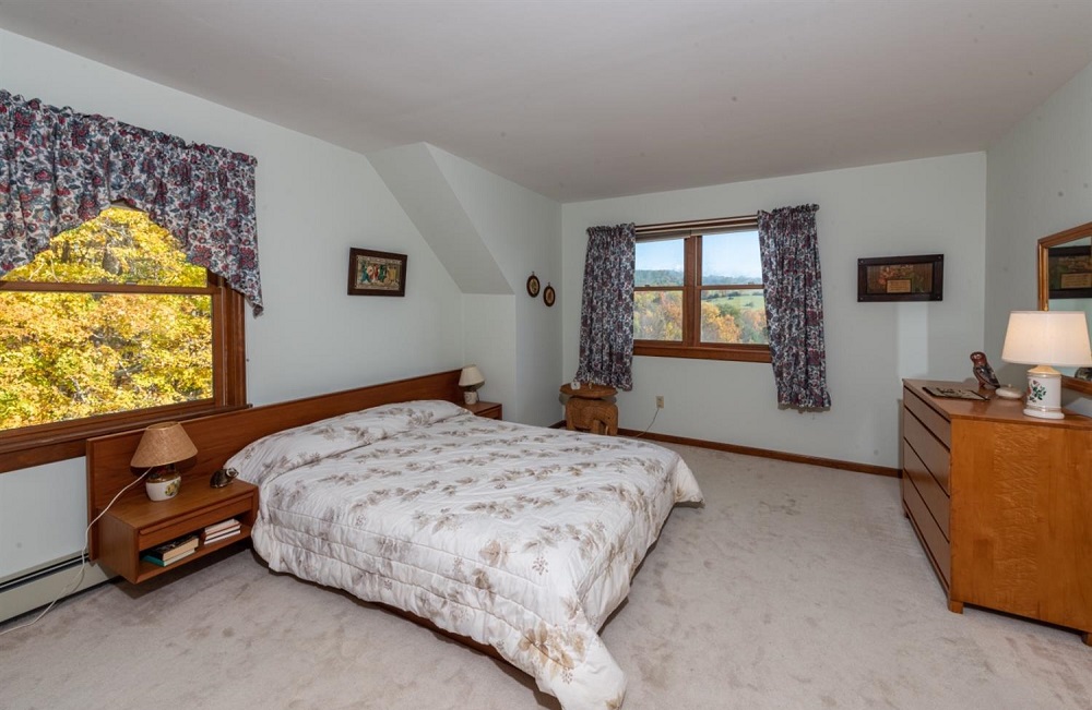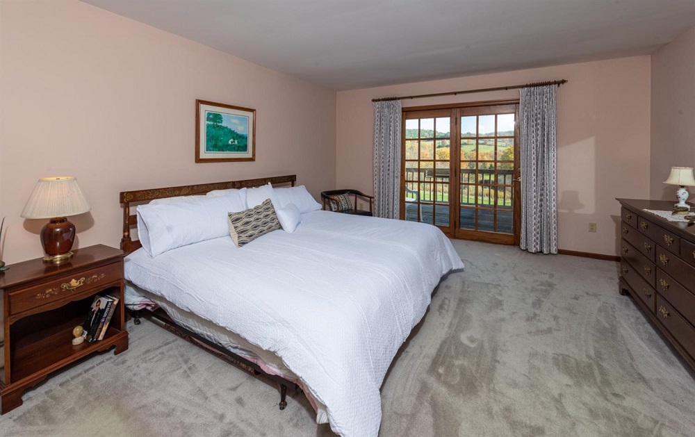 A house that makes perfect sense on a property that offers a fabulous location, beautiful views and tranquility. Every gathering room is generous in size. First floor en suite master, big eat-in country kitchen, plus a formal dining room. The living room has a vaulted ceiling, a picture window to the views of rolling hills, pond and farmland, plus a very impressive stone fireplace. 2 guest bedrooms share a full bath and there are two large multi  purpose rooms  in the basement with a walkout and 3/4 bath.